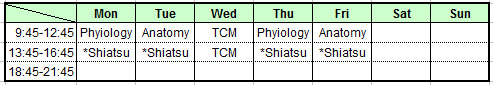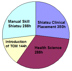 1070時間指圧プラクター本科課程は、フルタイムで1年、パートタイムで2年で全ての 課程を修了する、合計1070時間のプログラムです。課程は主に基礎医学(解剖学・生理学)、臨床学科(指圧)、東洋医学、臨床実習に分かれます。基礎指圧 クラス修了後、臨床経験=スクールクリニック(臨床実習)並びにフィールドワーク(実地訓練)に入ります。スクールクリニックは、祝日を除いて毎日 OPENしており、個々の事情にあわせてスケジュールを組む事が出来ます。フィールドワークはその時の状況によりスケジュールが発表されますので、これも 個々の事情に合わせカリキュラムを組む事ができます。