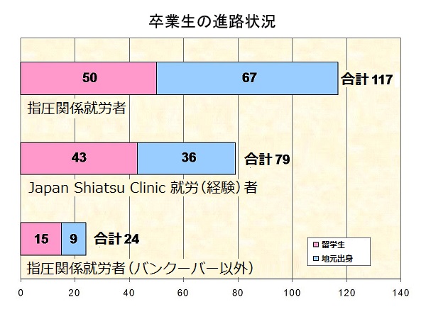 | 卒業生の進路は、併設のJapan Shiatsu Clinicで指圧師として勤務する卒業生、北アメリカ(アメリカ・カナダ)のホテルなどのスパやマッサージクリニックで勤務、自身のクリニックをオープン、指導者になる卒業生など様々です。ある卒業留学生は、母国へ帰国後に開業し、政府に指圧の効果を働きかけた結果、指圧が保険でカバーされるという素晴らしい功績を残した卒業生もいます。又、卒業後アメリカワシントン州の保健省認定のマッサージ免許を所得し、その後アメリカで活躍している卒業留学生もいます。卒業生の多くが当校で学んだ知識と経験を活かし、世界各地で活躍しています。なお、この統計は2017年1月1日現在のものです。 |